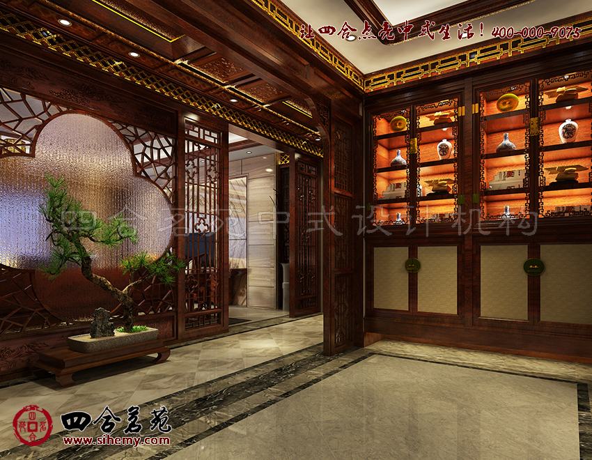 深色木作中式線條構成裝飾語匯,在柔和光線下烘托古韻氛圍。