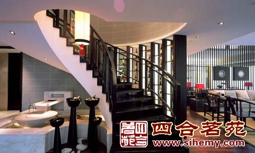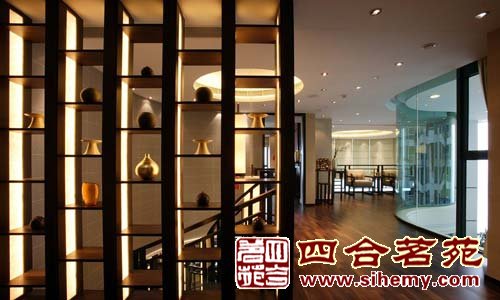 通過旋梯走上二樓,一側的陳設架上可以擺放此間主人收藏陶瓷玉器,即便是上下樓的片刻,人們也可以順勢飽飽眼福。