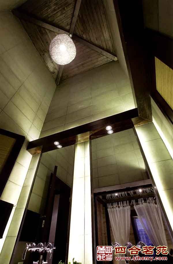 該案的天花采用帶坡面木梁架構(gòu),一看便叫人想起中國(guó)的經(jīng)典木制建筑。這種因?yàn)闅夂蚝偷乩項(xiàng)l件形成的建筑樣式是有東方情趣的,它和西方的磚石建筑相比是別具一番風(fēng)味的。它經(jīng)典,且非常具有室內(nèi)裝飾作用。