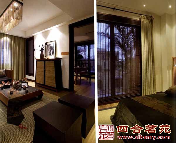 因?yàn)槟局茦?gòu)架和木制家居都是中式的表現(xiàn)樣式,所以空間的色彩表現(xiàn)就以木的原色作為基調(diào)。相應(yīng)的軟裝色彩,都從這個(gè)基調(diào)上延伸,不沖突,分出輕重緩急,和諧相融。