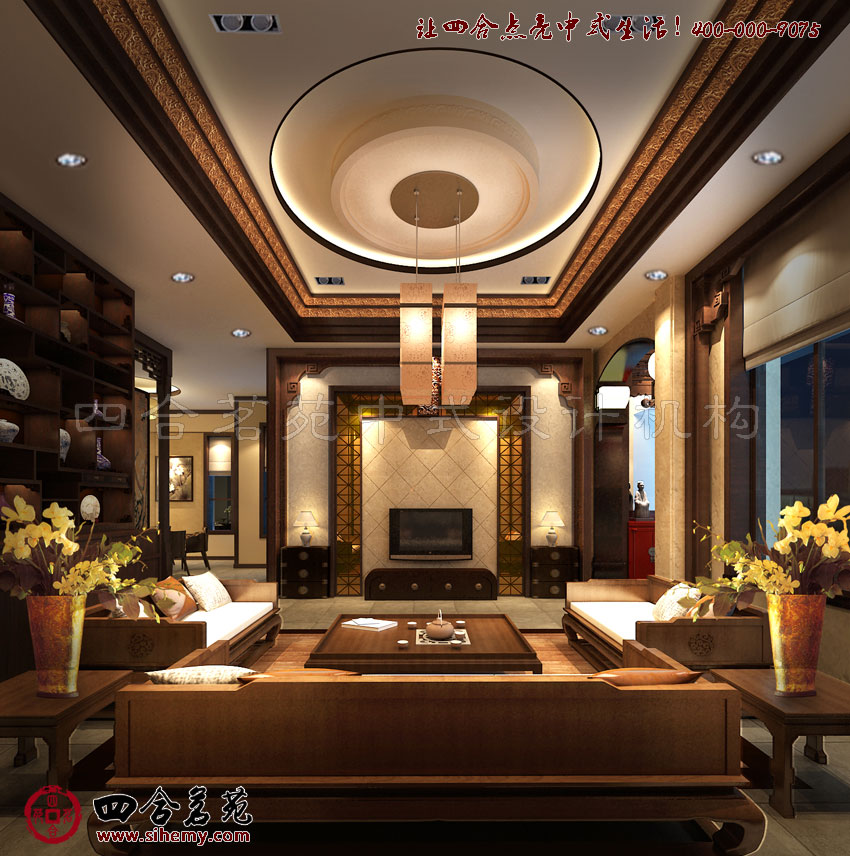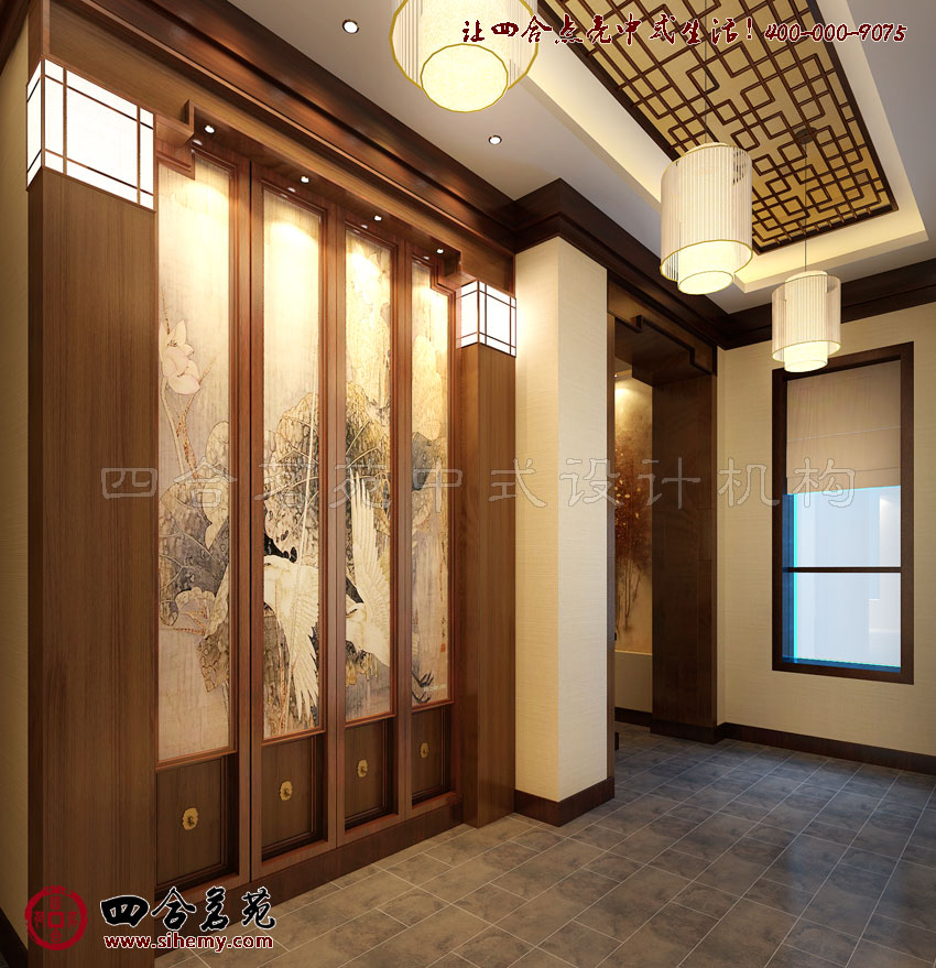 別墅裝修設(shè)計空間采用大花格板壁月洞區(qū)隔,在雋秀淡雅的紋飾點染下,使人感覺到藝術(shù)的同時更讓人覺得有一絲禪意和寧靜。突出中式環(huán)境淡雅的氛圍與至高品位。