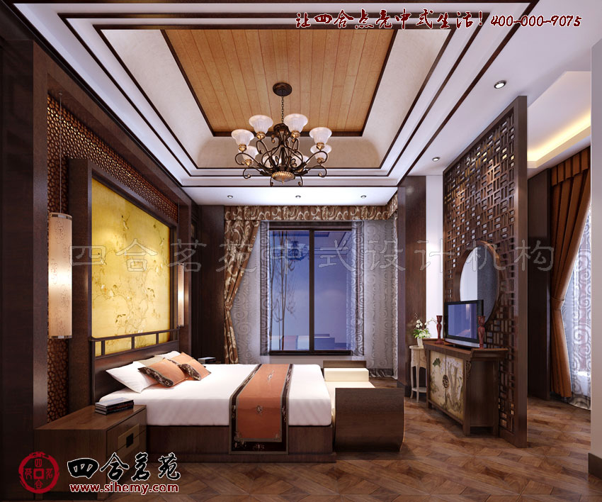臥室中幾何造型的運用始終沒有離開方正的中式,運用若隱若現(xiàn)的線條和三交六椀菱花來裝飾天花與墻壁。工筆畫點燃下的臥室增多了幾分生機(jī)。