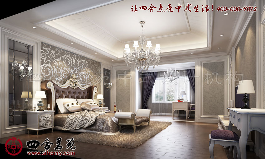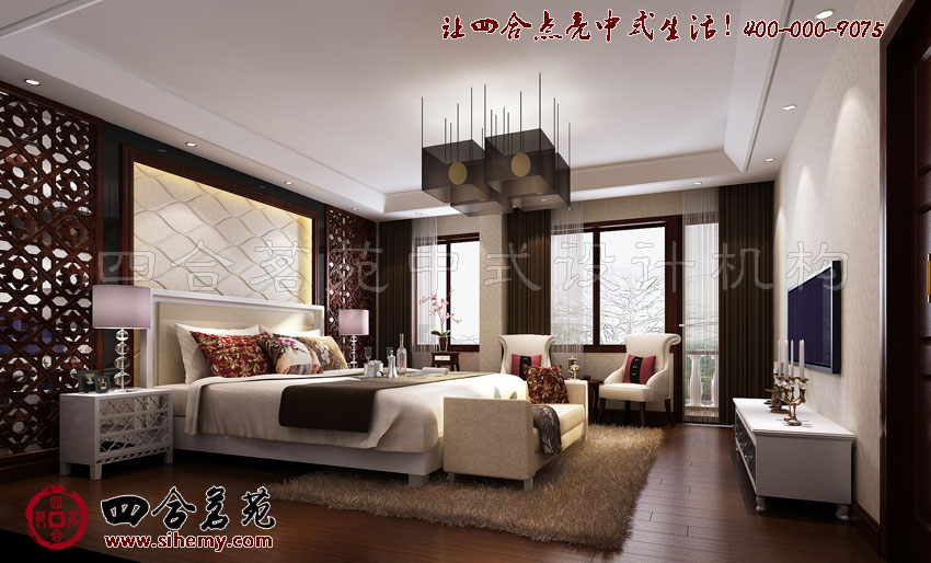 臥室采用開場布局,新中式別墅設計圖中疏朗的西洋元素與宮燈配合下凸顯著新中式高端別墅軟裝設計古今融合的視覺享受溫馨而高雅。