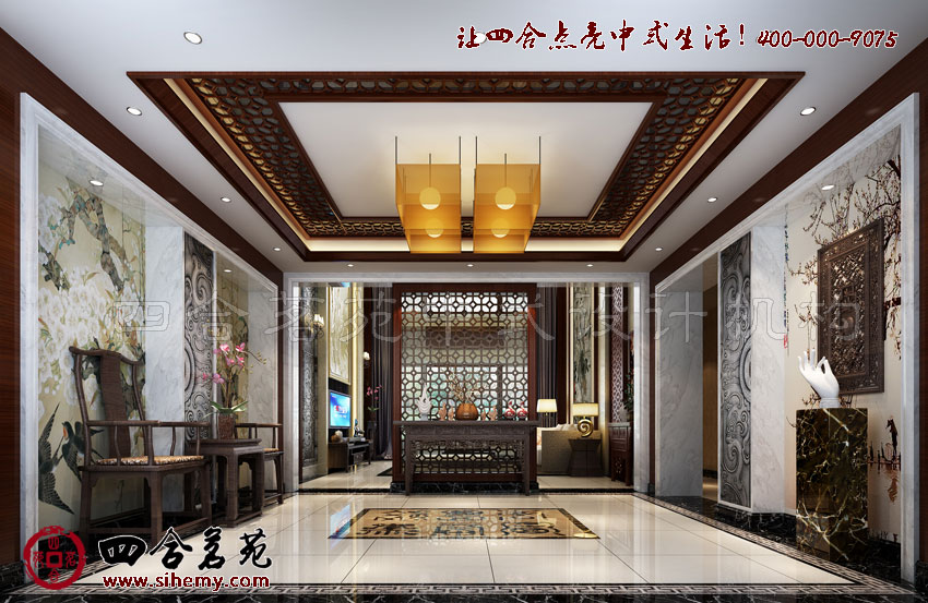 透過新中式別墅設計圖獨到的視覺,可以感受到大客廳擷取古典中式元素具有卓然非凡的花格、磚雕、回紋等元素,組建此案新中式高端別墅最具有恢弘氣勢的空間裝飾。