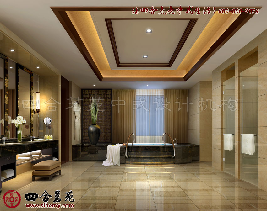 浴室延續(xù)了大空間大尺度的布局,在平整的鋪裝,榫卯謹(jǐn)實(shí)的裝飾下,西洋元素與中式元素巧妙融合,別墅裝修設(shè)計(jì)細(xì)節(jié)制勝的設(shè)計(jì)理念。