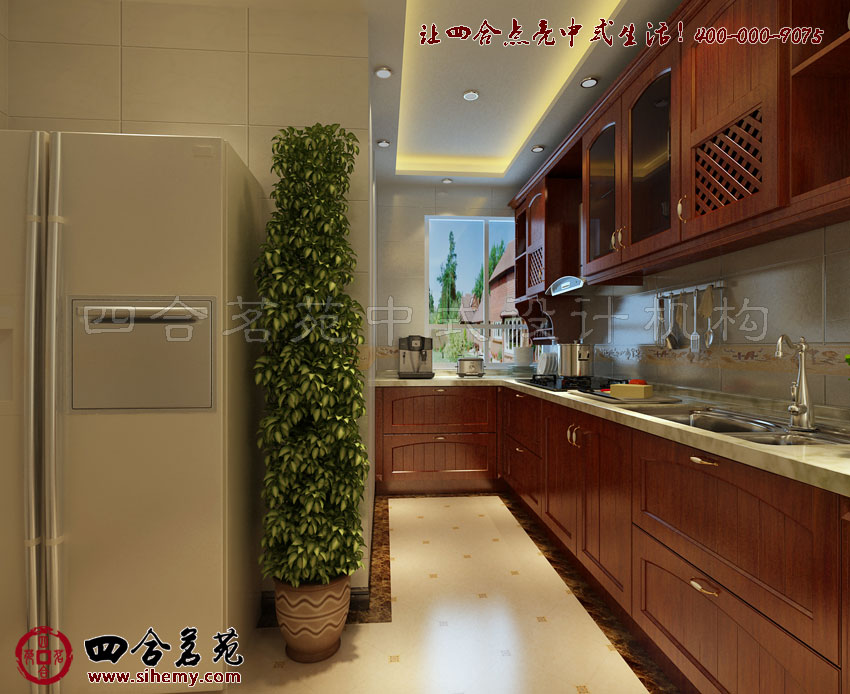四合茗苑設計師依托古典元素的運用,在別墅家裝古典中式櫥柜的裝飾上取材古典造型和色彩,以紅木家具作為別墅材料保障對于中式環境的渲染。