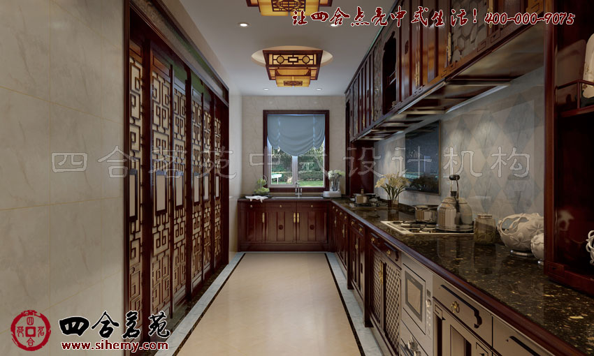 透過整齊的裝飾,別墅家裝古典中式櫥柜榫卯謹實,突出經典品質,別墅材料保障的獨到的品味,在流光的映襯下,呈現出邀人奪目的價質感。古典藝術在裝飾上在廚房操作間將功能滿足,同時也給人藝術質感。