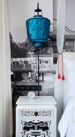 中式傳統鏤空花紋設計的白色床頭柜,配以藍色燈籠式的床頭燈,營造出充滿風韻的柔軟中國風。 將中式的花朵圖案直接運用于家具上,配以典型的中式配飾,讓人感覺親切,又不失傳統的典雅。 " />