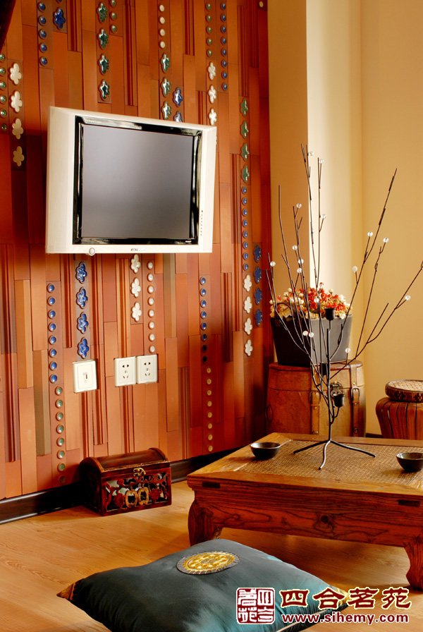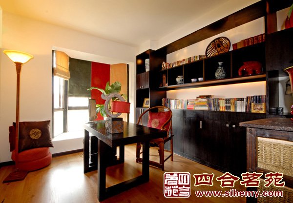 紅木家具、現(xiàn)代裝飾拼畫、橙色的布藝沙發(fā)組成暖意融融的客廳。