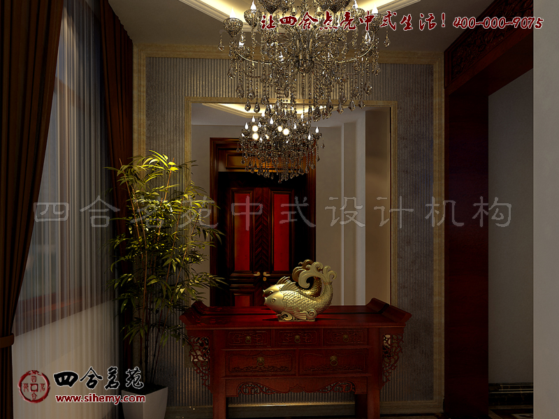 中式玄關柜,配具有吉祥寓意額魚形銅雕,在西洋吊燈的渲染下烘托了整體尊貴品質和家的感覺,而尊寵感也不言而喻。