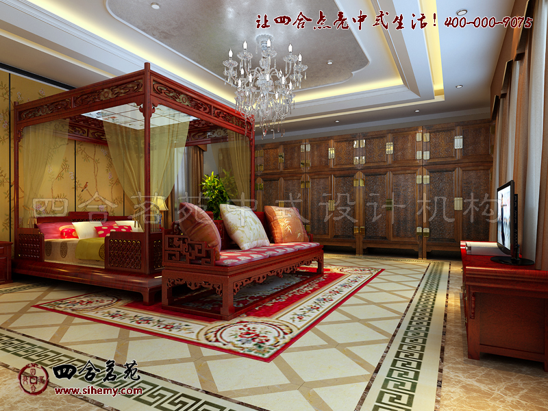 在臥室中式最能體幾種展現別墅裝修設計的奢華感,而施釉磚彩繪與西洋吊燈,一上一下,遙相輝映,體現著中式設計與下洋元素在空間中的交流。而在眾多中式紅木家具圍合的清逸雋秀,溫文爾雅的空間中,具有金屬光澤的天花板與吊燈等中式別墅軟裝配飾在四合茗苑擁有前瞻思維和全球視野的設計師筆下,從尺寸與選題的過渡關系中融合的天衣無縫。