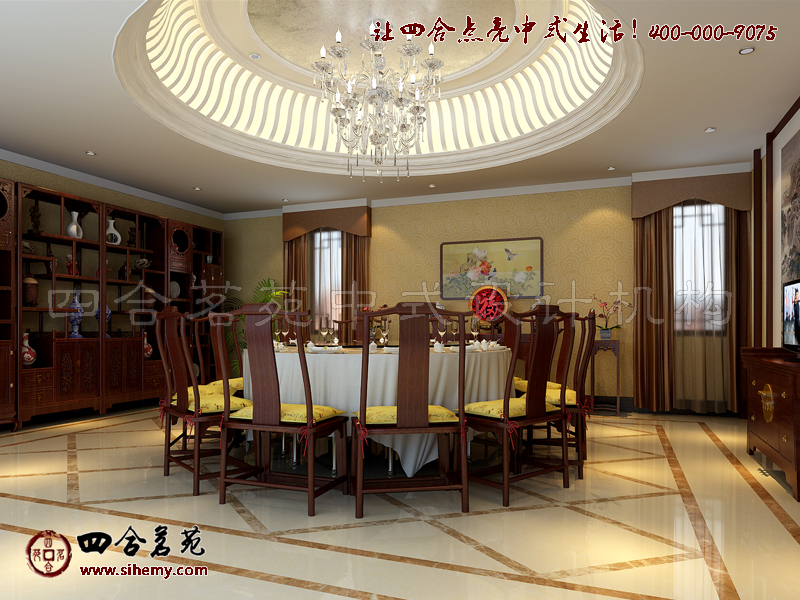 餐廳施釉磚組合出幾何圖形,與天花板圓形燈池遙相呼應,體現著天圓地方的主題性。在別墅裝修設計高妙的手法下餐廳裝飾大氣恢弘,展現了豪宅別墅設計案例所獨有額品味與氣勢。