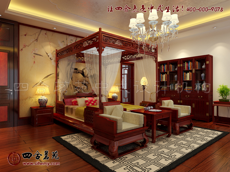 在臥室中,運用工筆畫在臥室墻壁上點染藻繪升華裝飾,架子床的帷帳的運用則增添了居住空間的尊寵體驗。鋪裝榫卯謹實,在光線的渲染下,由地面向上人們一次感覺到文雅與升級和金碧輝煌。