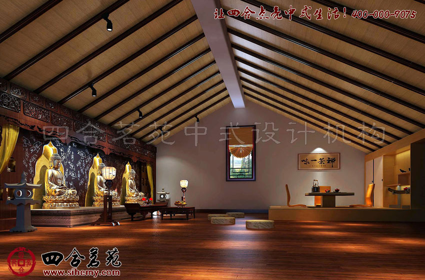 透過高端中式別墅效果圖閣樓的處理展現了四合茗苑中式設計師獨到的空間運用和對于烘托氛圍營造氣氛的把控能力,寶相莊嚴透過古典藝術筆觸,結合梁椽的使用感受到中式設計藝術的表現力。突出空間裝飾的藝術美感與中式韻味。