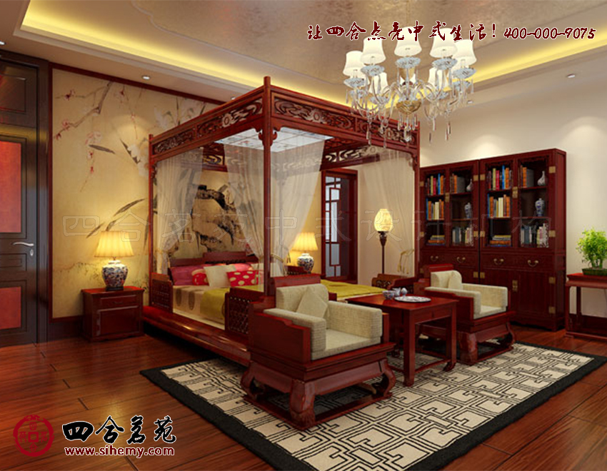 潔如珂雪的墻壁上點綴中式壁畫。薄紗、窗幔在光線渲染下讓設計更顯得綺麗多姿。