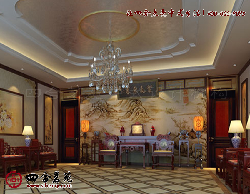 淺色鋪裝、深色家具,在光線下渲染著設計氛圍。此套現代中式效果圖,設計從天花板、墻面再到地面鋪裝,從圖形、色彩入手,輔助光線渲染,以期渲染設計氛圍更接近設計旨趣的展現。