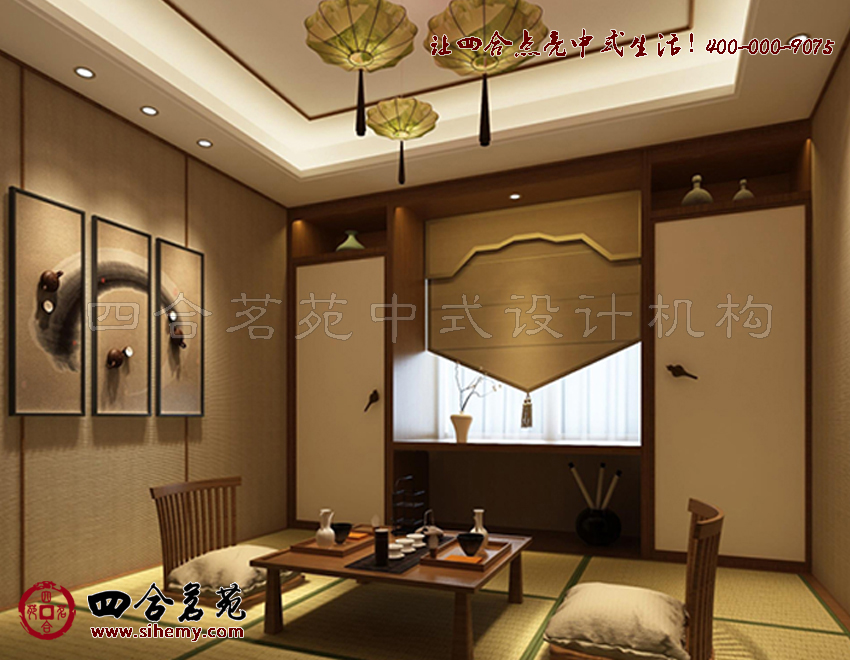 茶與禪總是會被聯系到一塊,所以茶室的設計著重在一個“空”上。席居的設計有效利用空間,在功用上對人們的腰椎、脊椎都有頗好的保健作用。于其上設置低矮的木質桌椅也增加空間的“透”。素白的推拉門扇,水墨的寫意掛壁,都為空間中增添一抹“不可言傳只可意會”的微妙體會。