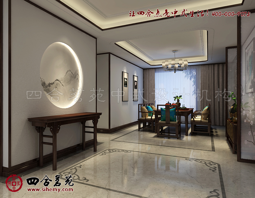 白墻上一輪弧線勾勒出圓形漏窗,并在其中以淡雅的寫意山水畫點綴。增添設計層次感,和提升空間藝術氛圍。