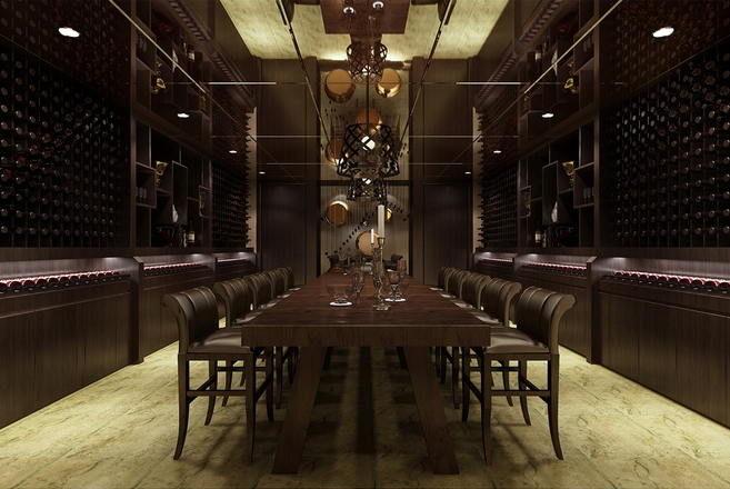 周末,約上三五知己好友,搓麻,或是一起上那酒窖品上一杯收藏多年的紅酒,生活樂無邊。根據麻將和紅酒各自不同的氣質和性格,在設計上也做了不同感覺的安排。麻將顯然偏向比較熱鬧的一項活動,所以多用素雅輕快的色彩,讓空間顯得活潑生動。而品味紅酒相對是一件優雅而莊重的事情,所以酒窖設計大氣而高貴,穩重的木質長桌和線條簡潔的低背椅,搭配兩列氣勢不凡的酒柜。天花采用鏡面設計,也讓空間增添一種高闊感。抿一口紅酒,抬首看那面色酡紅的鏡中人,是他在看你,也是你在看他,兩相看間,也是頗有種恍惚的迷醉感。