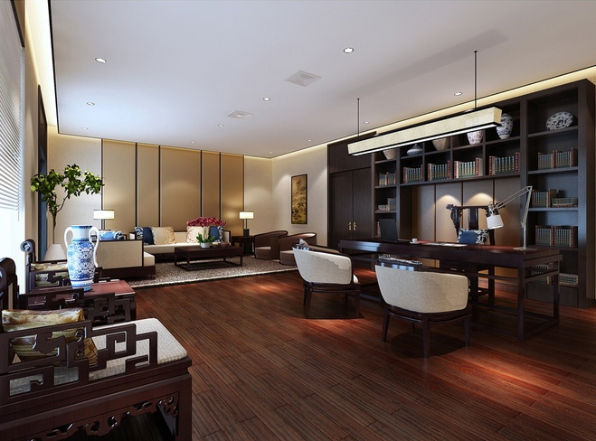 會客室就像客廳的一種延伸和擴展,保持一致的風格,色彩上基本就是紅木的木質原色和米色的互相照應。中式設計別墅里太師椅、官帽椅,幾案、書柜上陳設的青花瓷等中式元素,都讓空間充滿了一種古典而雅致的氛圍。