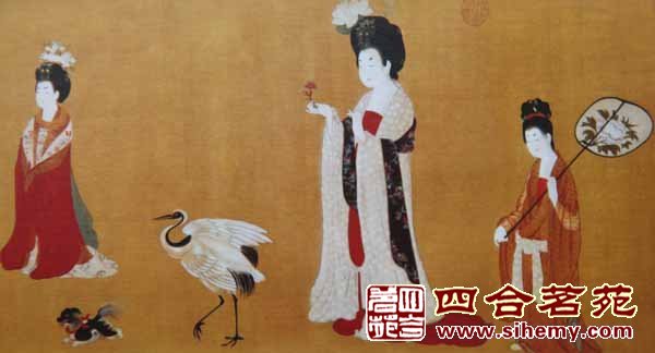 全圖人物線條簡勁圓渾而有力,設色濃艷富貴而不俗。能以簡潔有力的線條,準確地表現各種不同手勢。對衣紋和衣裙圖案的描繪信筆而成,似規整但又非常流動。至于人物發髻和鬢絲,精細過于毫毛,筆筆有飛動之勢。敷色雖然復雜,但層次清晰,絲綢間的疊壓關系交待得非常清楚。薄紗輕軟透明、皮膚光潔細潤的質感十分逼真。 全圖的構圖采取平鋪列繪的方式,仕女們的紗衣長裙和花髻是當時的盛裝,高髻時興上簪大牡丹,下插茉莉花,在黑發的襯托下,顯得雅潔、明麗。人物的描法以游絲描為主,行筆輕細柔媚,勻力平和,特別是在色彩的輔佐下成功地展示出紗羅和肌膚的質感。畫家在手臂上的輕紗敷染淡色,深于露膚而淡于紗,恰到好處地再現了滑如凝脂的肌膚和透明的薄紗,傳達出柔和、恬靜的美感。 此圖繪制時間約為唐貞元(公元785—805年)間,據前人著錄為周昉的作品。此圖經南宋高宗趙構收藏,卷尾鈐“紹興”聯珠印。又有賈似道的“悅生”瓢印等歷代諸家收藏印記。后經《石渠寶笈續編》著錄,遞藏有緒。周昉,名景元,字仲朗,出身貴族,世居長安,曾任宣州長史。好屬文,窮丹青之妙,擅畫肖像、尤工仕女。宋《宣和畫譜》載:“傳寫婦女,則為古今之冠,其稱譽流播,往往見于名士詩篇文字中。”(據沈從文的《中國古代服飾研究》,第八零章簪花仕女圖,此畫當非周昉原作。最早系宋人用宋制度繪唐事,據唐舊稿有所增飾,可能性較大。其人物面貌仍唐,衣服也為唐式,只是衣著花紋不合規格。這種簪花式樣,在唐代出現為偶然,在宋代出現為必然。