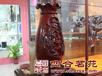 木雕花瓶,線條流暢優美,表面雕有許多復雜的花紋;更厲害的是它除了自己的美外,還具有實用性,插上白色的梅花或者其他淺顏色的花,中式風格的古樸泰然會非常濃烈的。