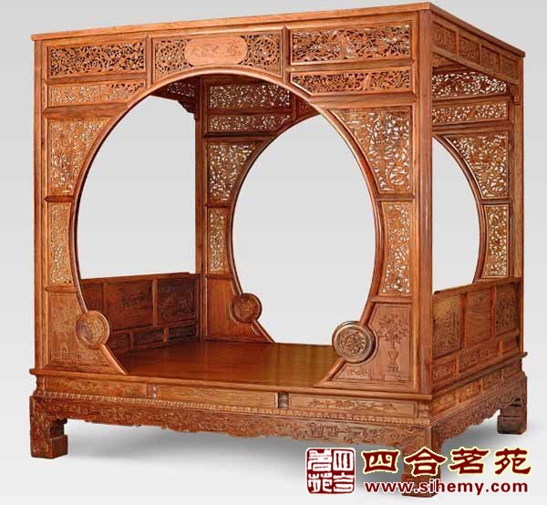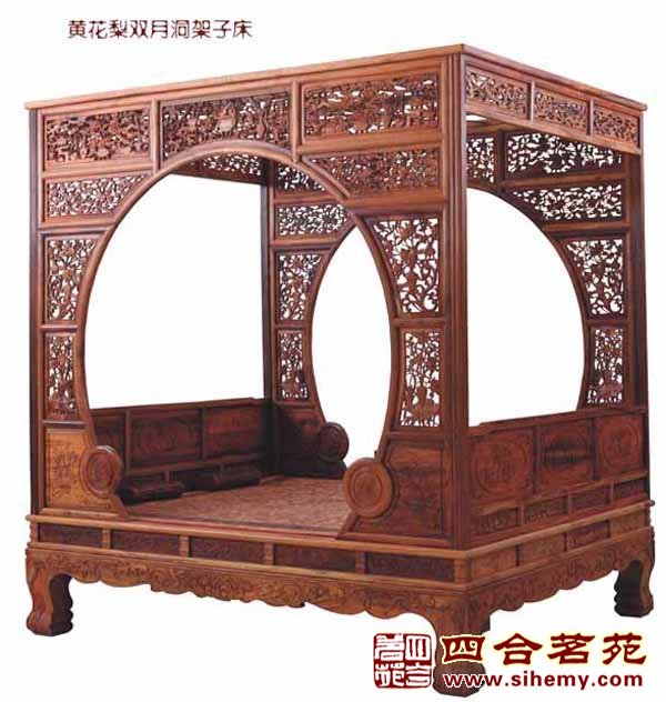 架子床在明家具中是體型較大的家具,做工精美,清雅別致,如以黃花梨木制作,彌足珍貴清代架 子床不僅用料厚乙形體高大,且圍欄、床柱、牙板、四足及上楣板等全部鏤雕花紋,還有在正面裝垂花門的玲瓏剔透。