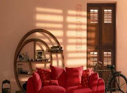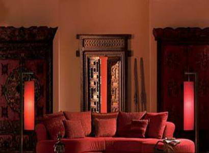 中式裝修家具 獨特文化韻味 沙發色彩運用傳統的中國紅,其背后還放置了一件明清式樣的家具,留白的墻面上印有書畫落款。因中式風格的家具古板,缺少現代氣息,因此只能在家居中點綴之用。