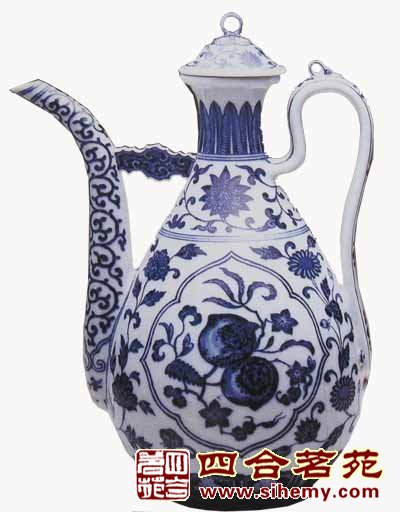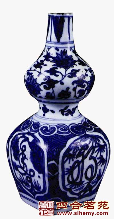 成熟的青花瓷出現在元代的景德鎮。元青花瓷的胎由于采用了“瓷石+高嶺土”的二元配方,使胎中的Al2O3含量增高,燒成溫度提高,焙燒過程中的變形率減少。多數器物的胎體也因此厚重,造型厚實飽滿。胎色略帶灰、黃,胎質疏松。底釉分青白和卵白兩種,乳濁感強。其使用的青料包括國產料和進口料兩種:國產料為高錳低鐵型青料,呈色青藍偏灰黑;進口料為低錳高鐵型青料,呈色青翠濃艷,有鐵銹斑痕。在部分器物上,也有國產料和進口料并用的情況。器型主要有日用器、供器、鎮墓器等類,尤以竹節高足杯、帶座器、鎮墓器最具時代特色。除玉壺春底足蕩釉外,其它器物底多砂底無釉,見火石紅。元青花的紋飾最大特點是構圖豐滿,層次多而不亂。筆法以一筆點劃多見,流暢有力;勾勒渲染則粗壯沉著。主題紋飾的題材有人物、動物、植物、詩文等。人物有高士圖(四愛圖)、歷史人物等;動物有龍鳳、麒麟、鴛鴦、游魚等;植物常見的有牡丹、蓮花、蘭花、松竹梅、靈芝、花葉、瓜果等;詩文極少見。所畫牡丹的花瓣多留白邊;龍紋為小頭、細頸、長身、三爪或四爪、背部出脊、鱗紋多為網格狀,矯健而兇猛。輔助紋飾多為卷草、蓮瓣、古錢、海水、回紋、朵云、蕉葉等。蓮瓣紋形狀似“大括號”,蓮瓣中常繪道家雜寶;如意云紋中常繪海八怪或折枝蓮花、纏枝花卉,繪三階云;蕉葉中梗為實心(填滿青料);海水紋為粗線與細線描繪相結合。